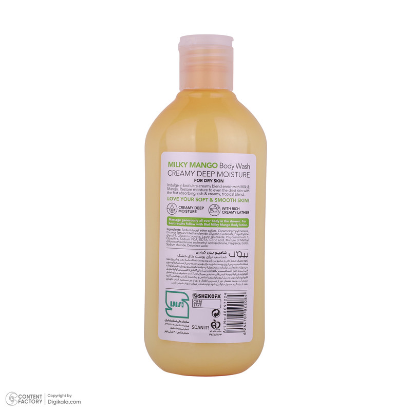 | سایر توضیحات | شامپو بدن بیول کرمی Milky Mango فرمولاسیونی ملایم و آبرسان دارد و با شستشوی عمیق پوست از رطوبت طبیعی پوست محافظت میکند. فرمولاسیون گیاهی و ملایم این محصول از سلامت پوست خشک اطمینان حاصل کرده و رایحهی شیرین و جذاب آن در طول روز شما را همراهی میکند. شوینده با بافت کرمی و محافظ پوست/ با خاصیت مرطوب کنندگی و نرم کنندگی پوست/ با رایحهی انبهای و میوهای/ مناسب پوست های خشک. |
